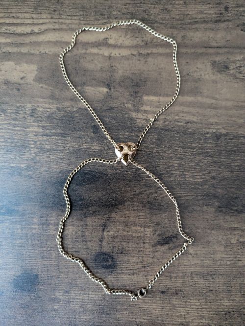 小さな花々が描かれたハート型と、星をモチーフにした小粒パール付きのチェーンストッパー2個セットです。チェーンの装着の工夫次第でさまざまなファッションスタイルの変化を楽しめます。