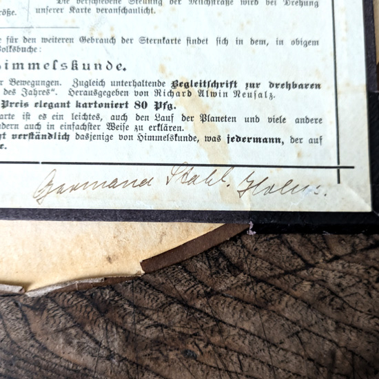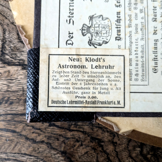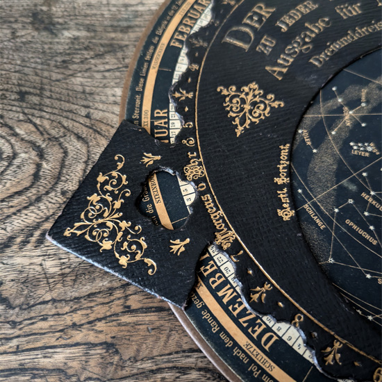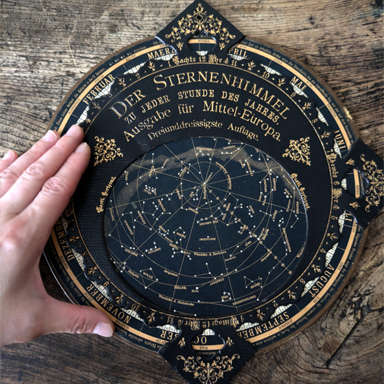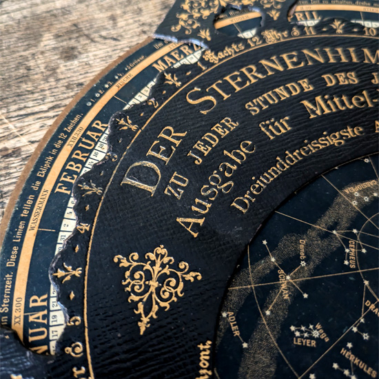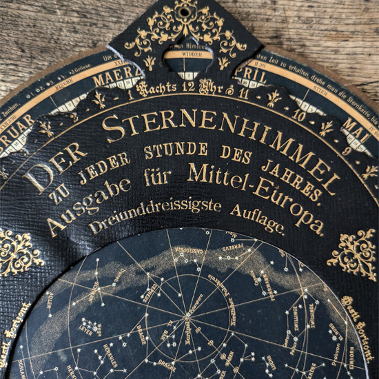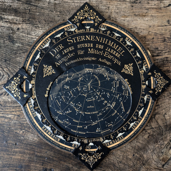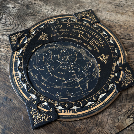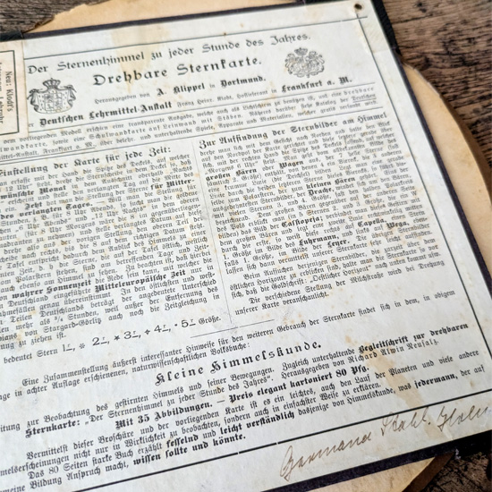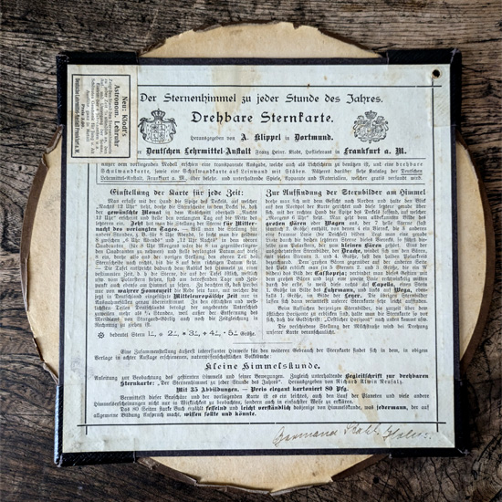 ドイツ、ドルトムントのクリッペル社製の星座早見盤です。古い星座早見盤は英国フィリップ社製の物が出回る数からして見かけた方も多いかと思いますが、こちらはその原型とされるクリッペル社製で、デザイン性がまた秀逸で、革製のような深い紺色紙に、四方に散りばめられた優雅な箔押しの彩りと文字バランスとが大変美しい星座早見盤です。
