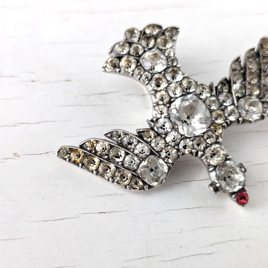 こちらは貴重なブラックドットペーストを用い、ジョージアン後期からヴィクトリアン時代に作られたと思われる銀の鳥のペンダントです。モチーフの鳥はキリスト教の平和の象徴である鳩。風切から尾羽にかけての絶妙なガラスのグラデーションの細工は素晴らしく、なおかつアンティークガラスのしっとりとした奥行きのある輝きがたまりません。さまざまなブラックドットペーストのジュエリーがありますがその多くははっきりとしたモチーフの物は少なく、このような見事な細工の鳥のジュエリーは大変希少です。