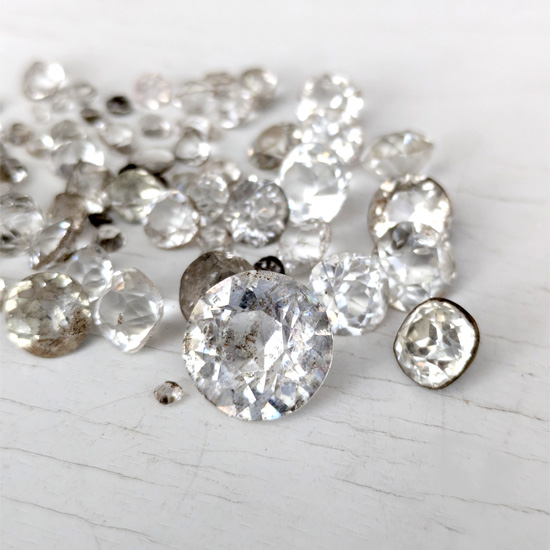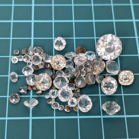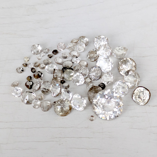 ラウンド、クッション型を基本にその他の形の物もあり、大きな物からかなり小さなルースまで入っています。手仕事の時代の繊細なカットで美しく輝くきらめきと、アンティークのこっくりとした風合いがあります。