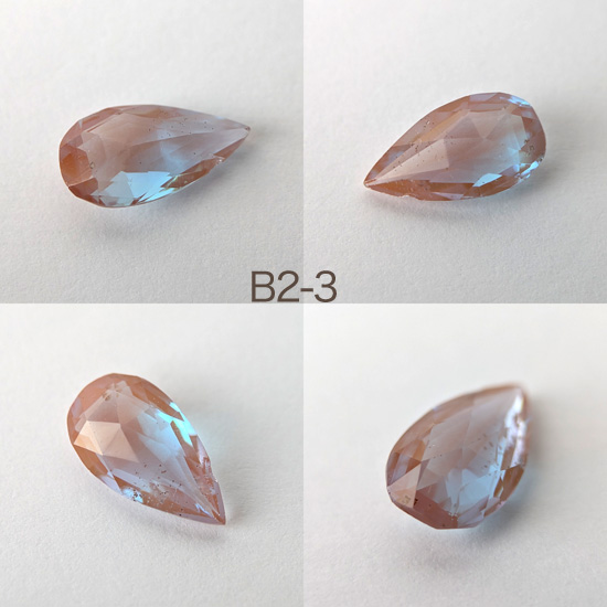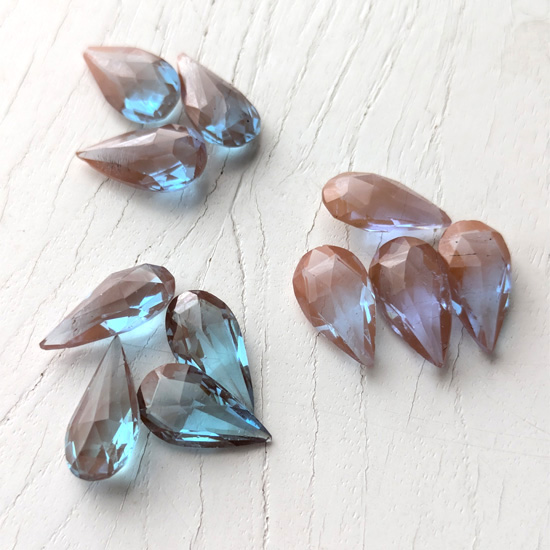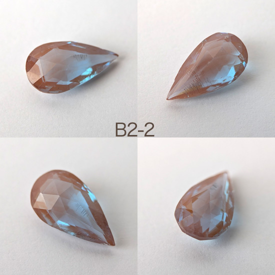 1900年頃チェコ製サフィレットルースペア型、丁寧にカットされたルースでAタイプよりココアブラウンがいくぶん濃く、やわらかな青みが美しいです。サイズ約1.5cm×8mm〜1.6cm×9mmほど。先端に欠けや小さなチップ、アンティークガラス特有の内部のしわ、黒ずみ等ありますが目視上では目立つほどではありません。バリエーションより選択ください。