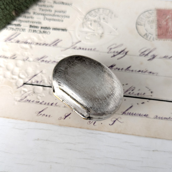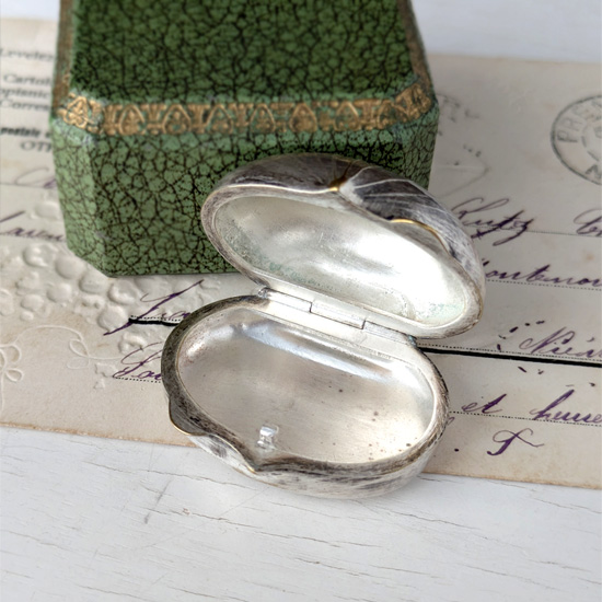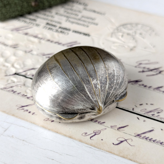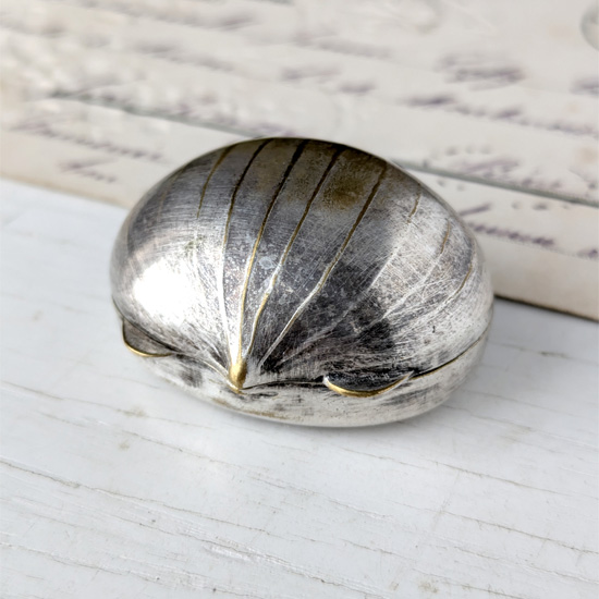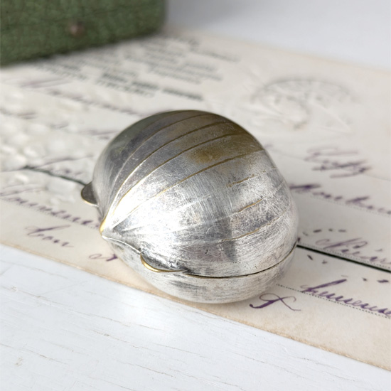 銀色の栗の小さなケースです。大きさもちょうど本物の栗と同じサイズで、栗の微妙な質感が表現されたアンティークらしさのあるかわいらしい小物入れです。練り香水を入れたりピルケースとして使用したり、秋のアンティーク小物として季節をお楽しみください。開閉は問題なくしっかりパチリと閉まります。