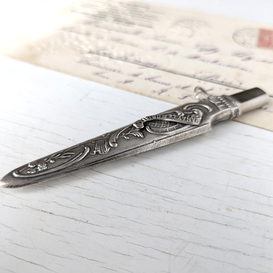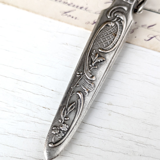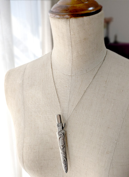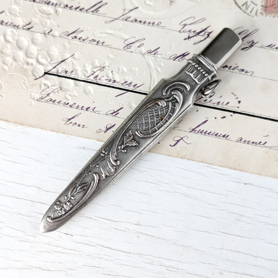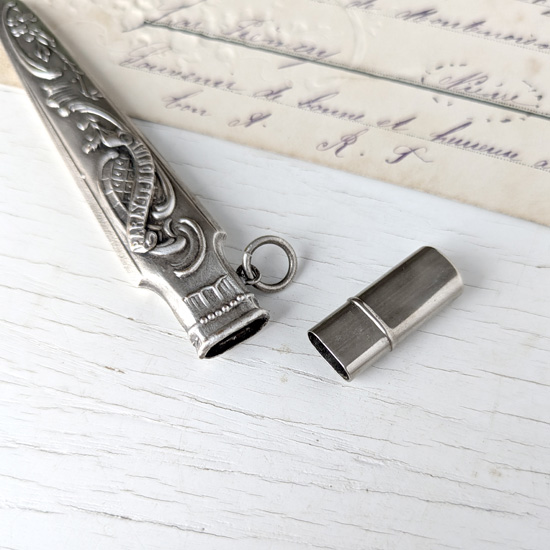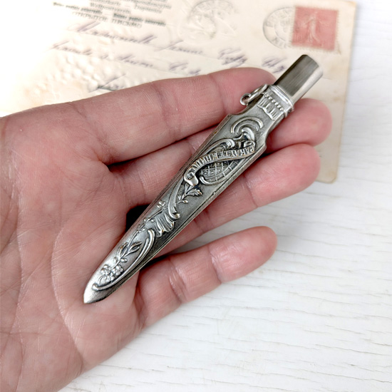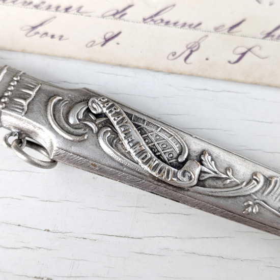 18世紀から19世紀にかけて欧州で流行した、身の回りの品を腰から下げて携帯する当時のお洒落装身具シャトレーン。さまざまなシャトレーンがありますがこちらは鉛筆ホルダーで、柄にはブルゴーニュ地方巡礼地『PARAY LE MONIAL』の文字とアールヌーヴォー調のロカイユと植物が描かれており、その地のスーベニールだったのでしょう。特に目立つようなダメージはありません。