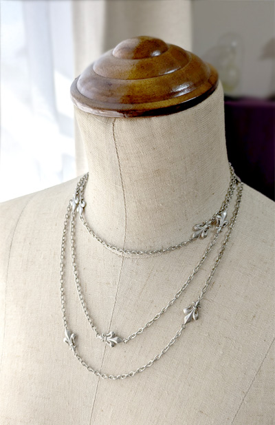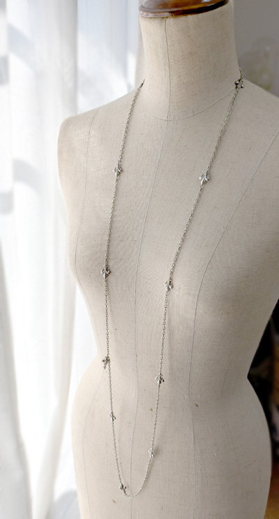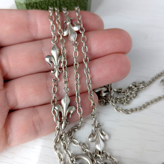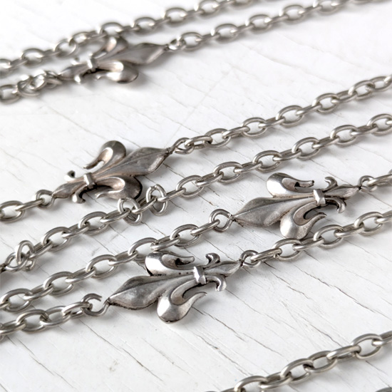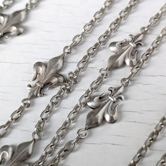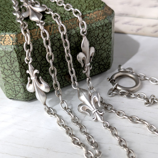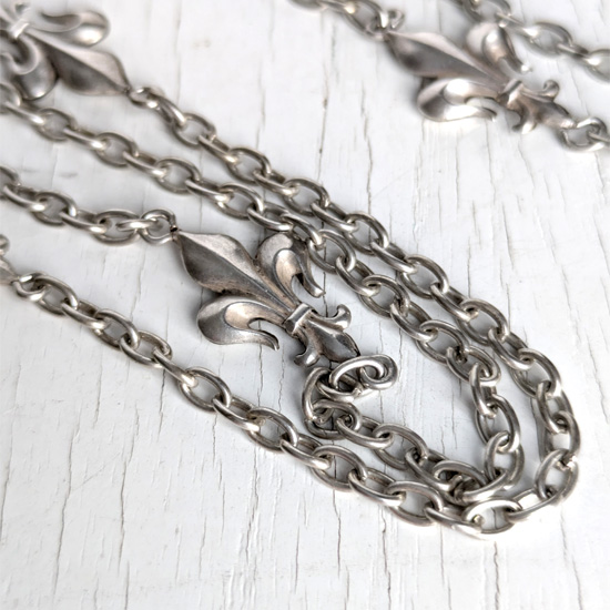 王家の印、百合の紋章フルールドリスのシルバーロングチェーンです。アンティークシルバーの鈍い銀色と、艶消しのしっとりとした質感がたまらない美しさです。このようにモチーフが付いたシルバーチェーンはなかなか無く、アンティークでのファッションを楽しまれる方に大変おすすめです。チェーンを二重、三重と変えたり、チェーンストッパーなどでアクセントを加えたり等さまざま活用でき、1本あると多様なスタイルを楽しめます。