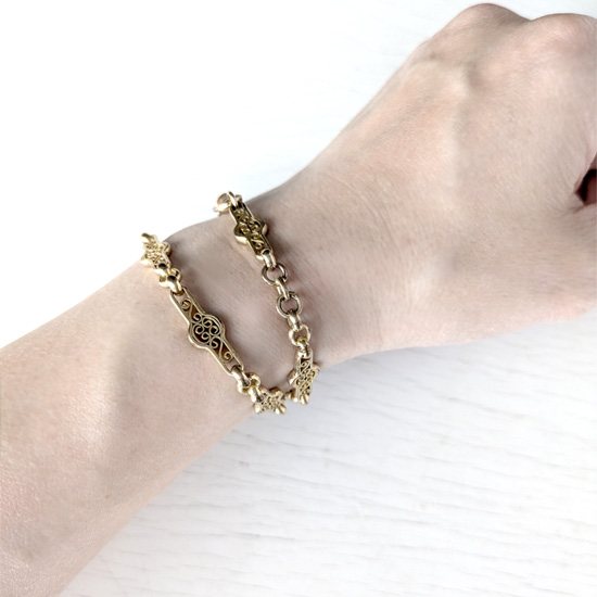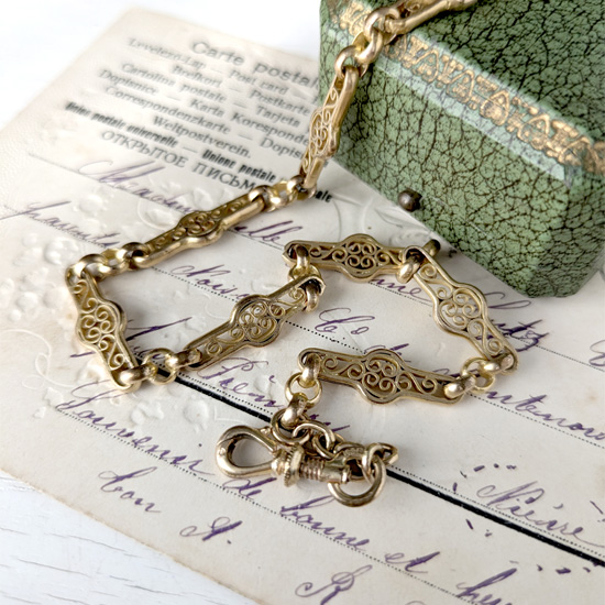 輝く金色と透かしフィリグリー細工が豪奢な懐中時計用チェーンです。ひとつひとつのパーツは厚くしっかりとしているため重厚感があり、高級感があります。留め具部分にフランスの銀器メーカー『TALLOIS』(タロワ)の刻印が押されています。