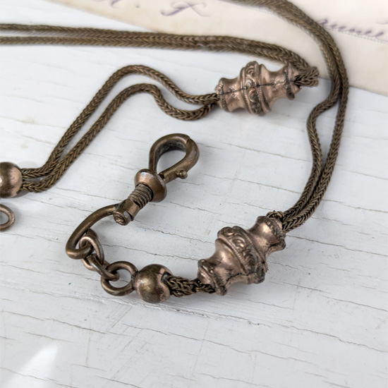 こちらは留め具を下に回転させフックを外すという仕様で、懐中時計のチェーンのほか、2巻でのブレスレットとしてもご利用いただけます。