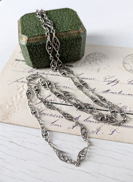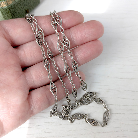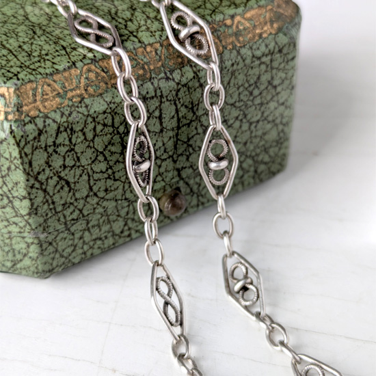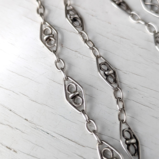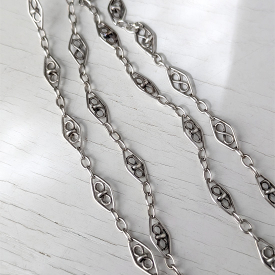 銀のフィリグリーネックレスです。ひとつずつ丁寧に∞型に加工された、落ち着いて輝き過ぎない銀色が心地よく、軽やかにエレガントな装いをお楽しみいただけます。歪み等特に気になるところはありません。