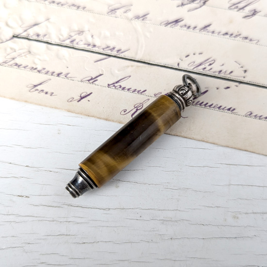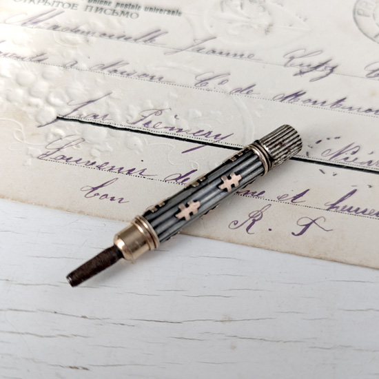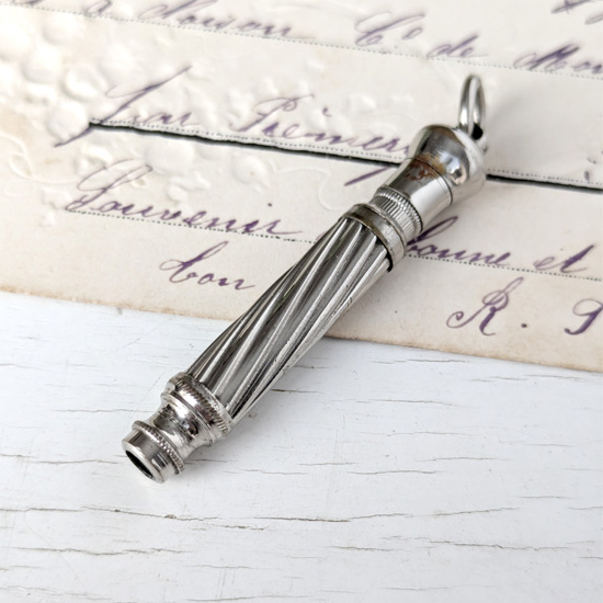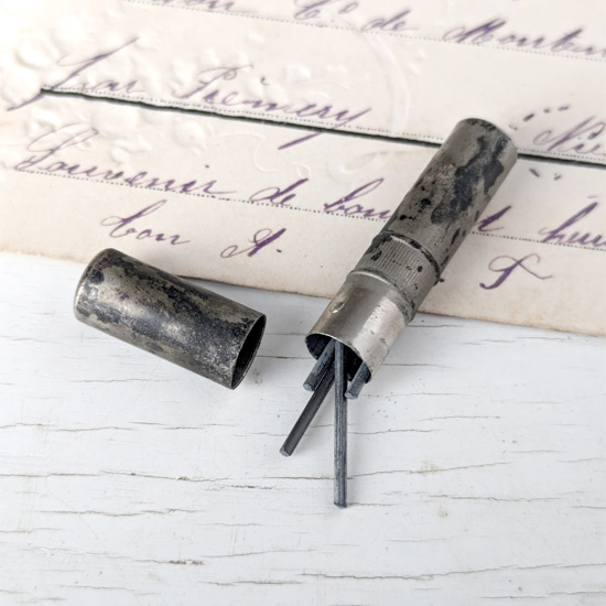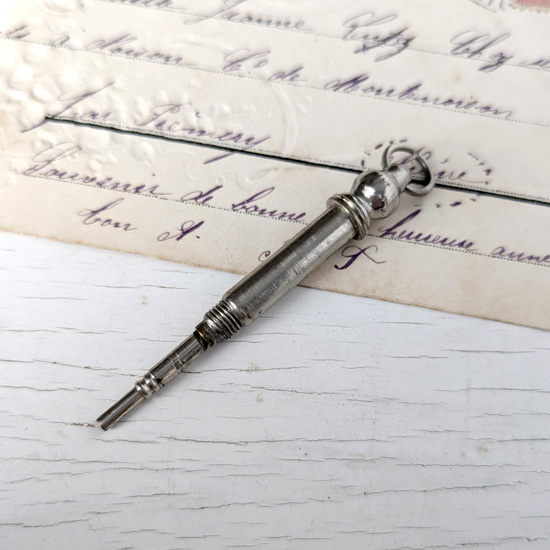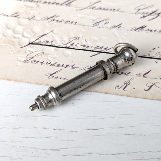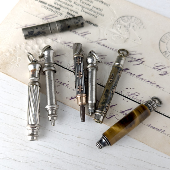 シャトレーンの飾り、または小さなポーチ用にと使われた伸縮式のペンシル6個セットです。当時の替え芯が付きます。