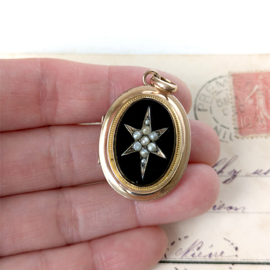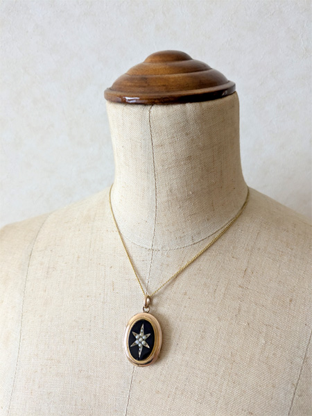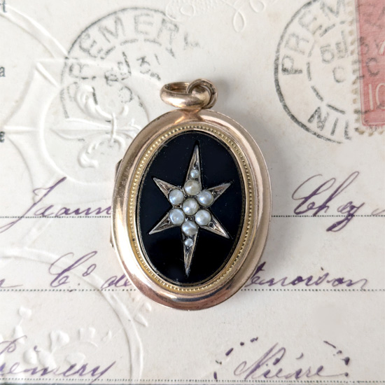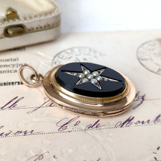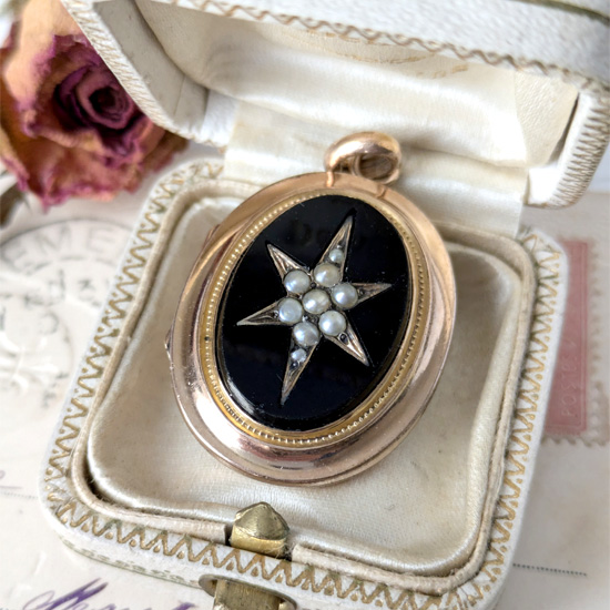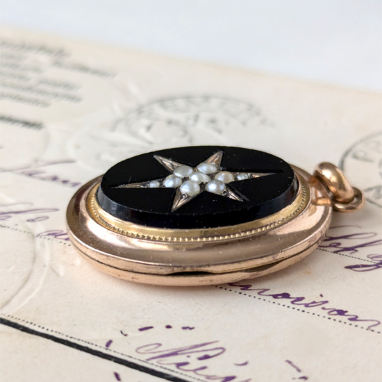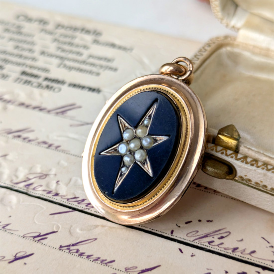 漆黒のフレンチジェットに輝くシードパールの星。モーニング(喪)のためのロケットペンダントです。自信の愛する者を想い写真などを入れていたのでしょうか。ペンダントは黒の中に輝く白い真珠の星は印象的で、哀愁の中にも輝く希望を感じるかのようです。