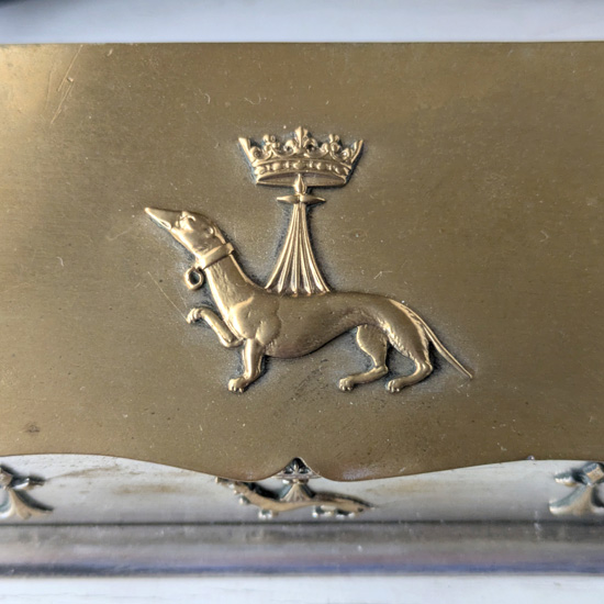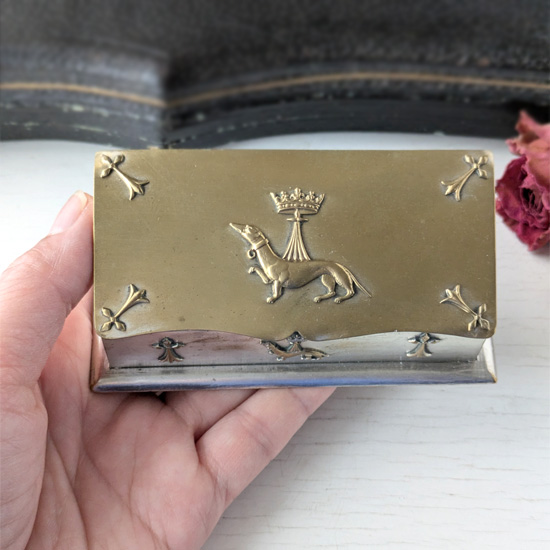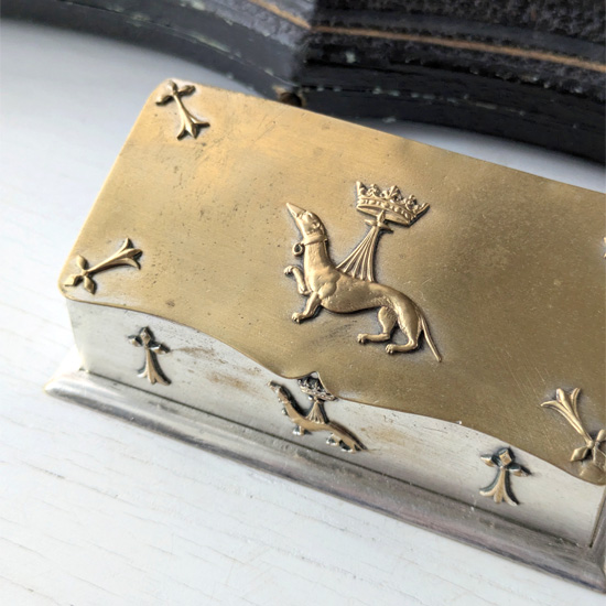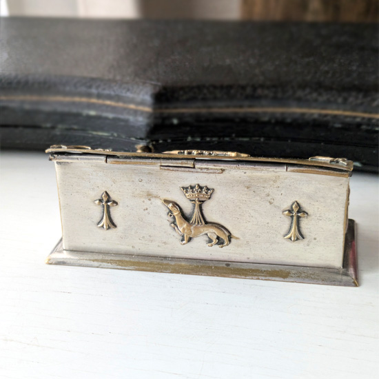 フランスはヴァロア朝、シャルル8世、ルイ12世の2代のフランス国王の王妃、アンヌ・ド・ブルターニュのエルミン紋章の三連切手ケースです。正面から横、背面と紋章があしらわれています。だいぶ使用されてきたようで蓋面の鍍金はほぼ薄れ、地金の金色が見えた様もまた年月の趣が感じられます。仕切りは大き目のサイズのため現代の切手も収納可能で、切手に限らずさまざまな小物類を収めお楽しみください。
