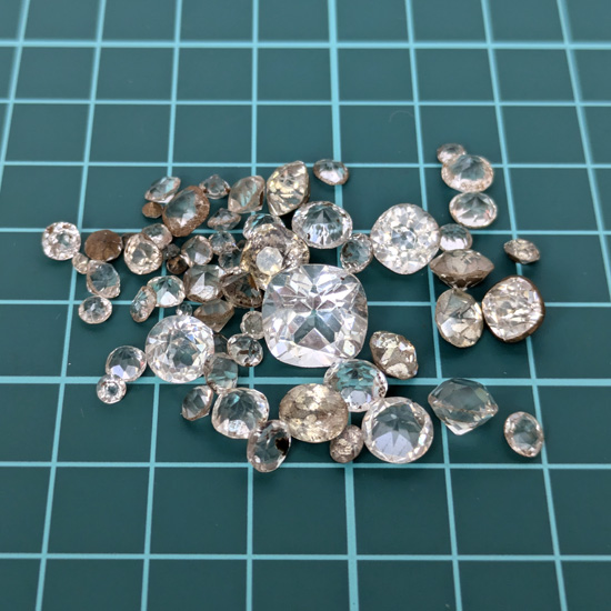 ラウンド、クッション型を基本にその他の形の物もあり、大きな物からかなり小さなルースまで入っています。手仕事の時代の繊細なカットで美しく輝くきらめきと、アンティークのこっくりとした風合いがあります。