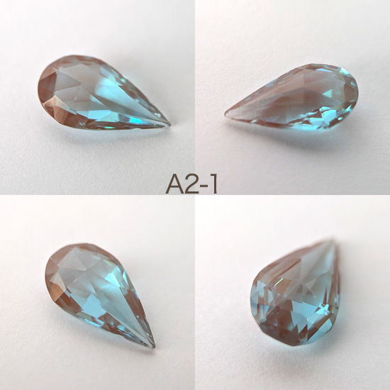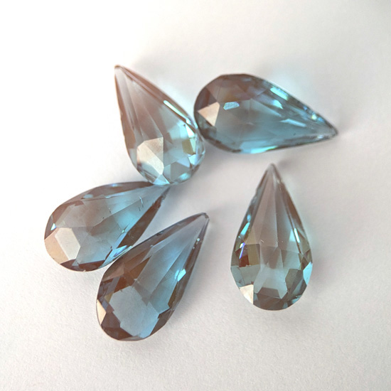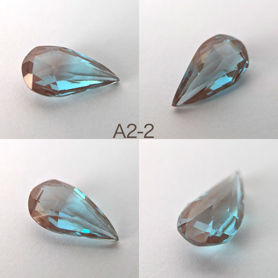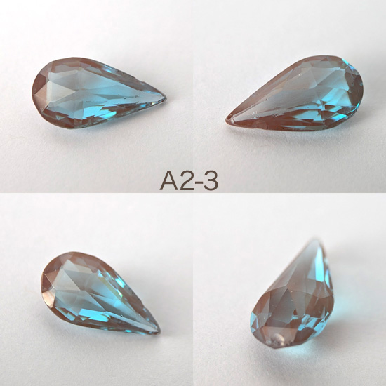 1900年頃チェコ製サフィレットルースペア型、丁寧にカットされたルースでグリーンみのあるブルーです。サイズ約1.5cm×8mm〜1.6cm×9mmほど。先端の欠けやチップ、アンティークガラス特有の内部の気泡、しわ、黒ずみ等がありますが目視上それほど目立たず比較的状態は良いです。バリエーションより選択ください。