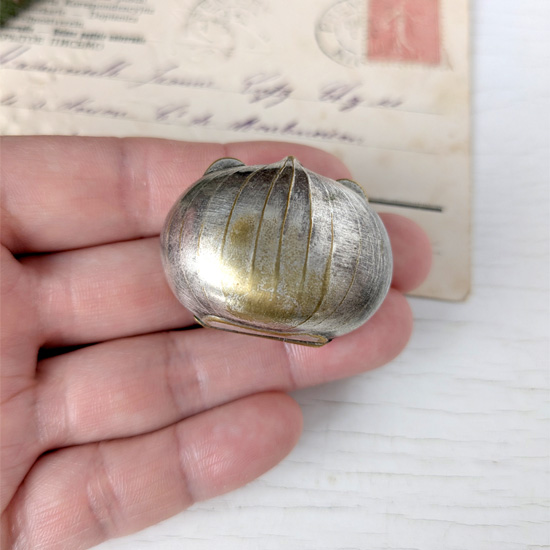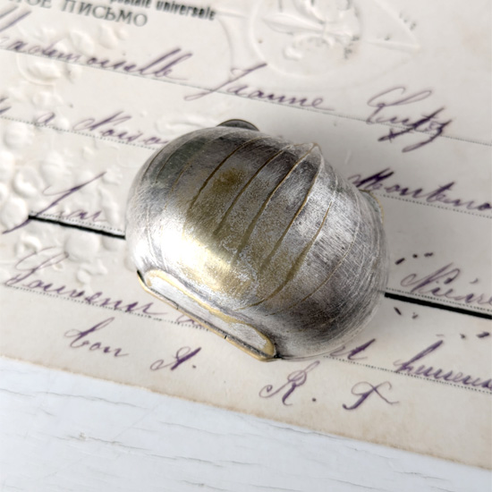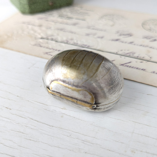 銀色の栗の小さなケースです。大きさもちょうど本物の栗と同じサイズで、栗の微妙な質感が表現されたアンティークらしさのあるかわいらしい小物入れです。練り香水を入れたりピルケースとして使用したり、秋のアンティーク小物として季節をお楽しみください。開閉は問題なくしっかりパチリと閉まります。