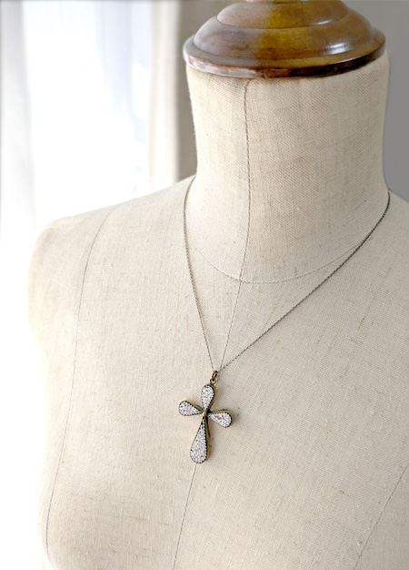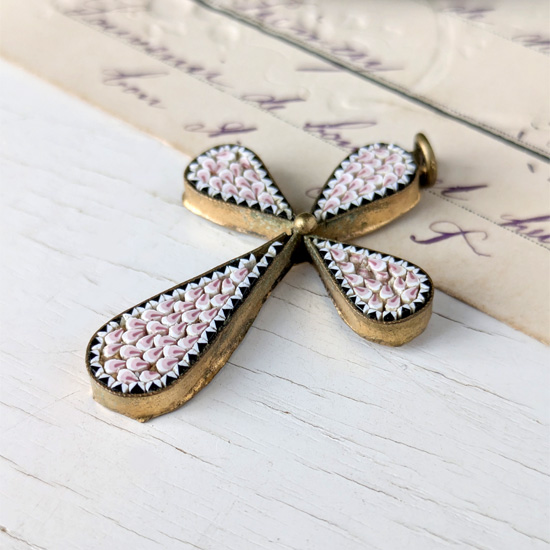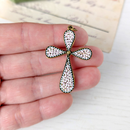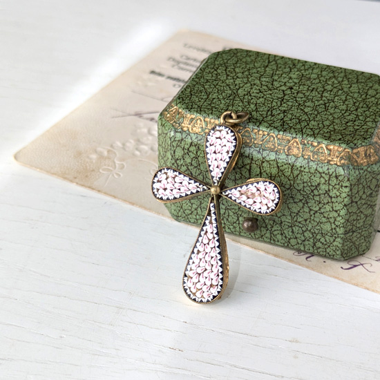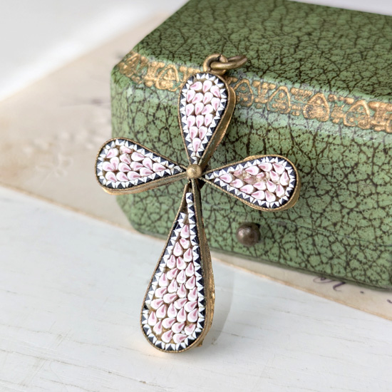 古いマイクロモザイクといえば鮮やかな色彩や花柄の物が多いのですが、こちらは単色、桃色をベースとしたシンプルな色味のマイクロモザイクです。またふっくらとした型の、十字架モチーフとしては珍しい形となっておりマイクロモザイクとしては変わった風合いを感じるペンダントとなっています。