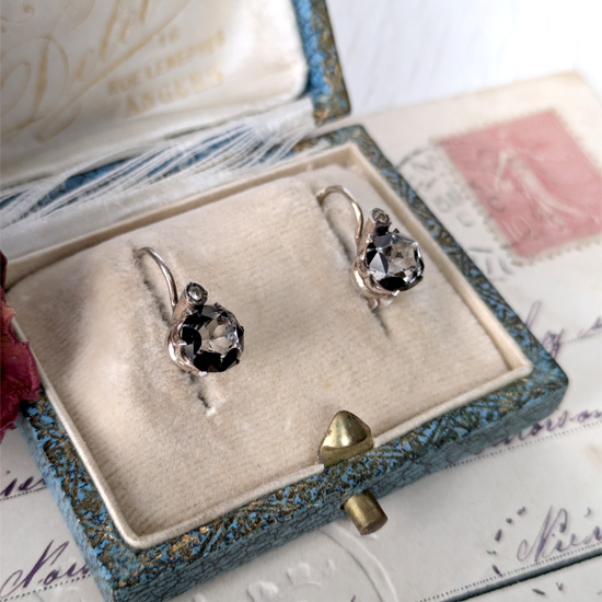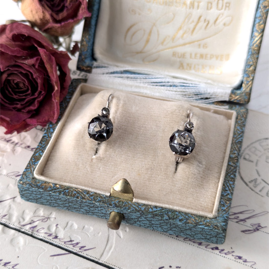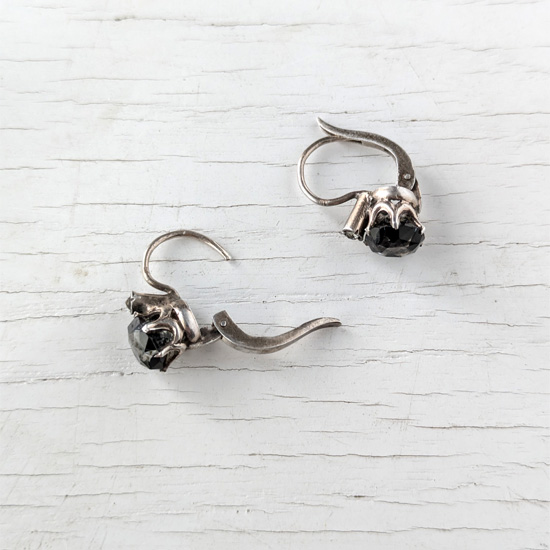 黒のスカラップがシックな上品さを感じさせるベルリンガラス。その中でも滅多にない希少なピアスタイプの耳飾りです。上部にはごく極小ワンポイントのクリアガラス、そして陽があたるときらきらと輝くベルリンガラス。王冠のような細い爪で飾られた繊細で小さな耳飾りは日本人女性にぴったりかと思います。