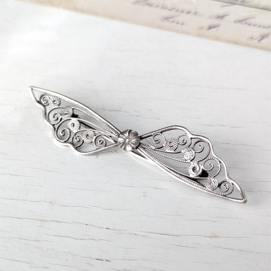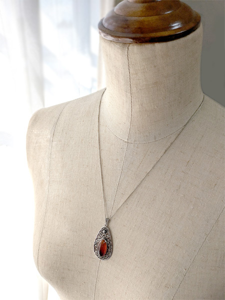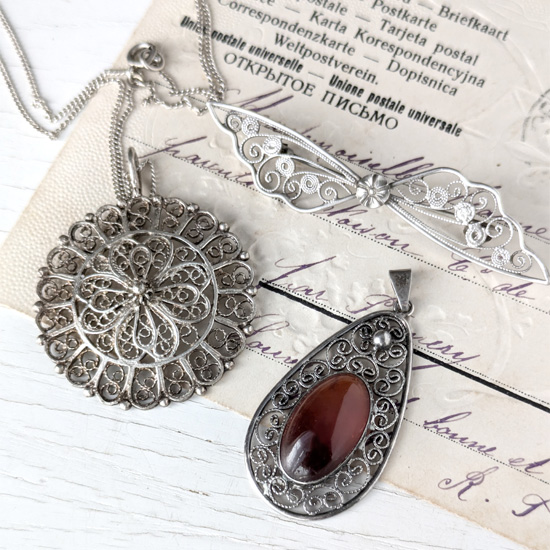 細い銀線を巻き上げ溶接し模様を作り上げる、繊細な手作業で作られるフィリグリー細工。型押しのフィリグリー風の物もありますが、こちらは3つとも全て丁寧に細い銀線で作られています。バラ窓のようなペンダント、琥珀ペンダントとブローチの大変お得な3個セットです。