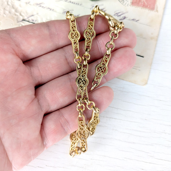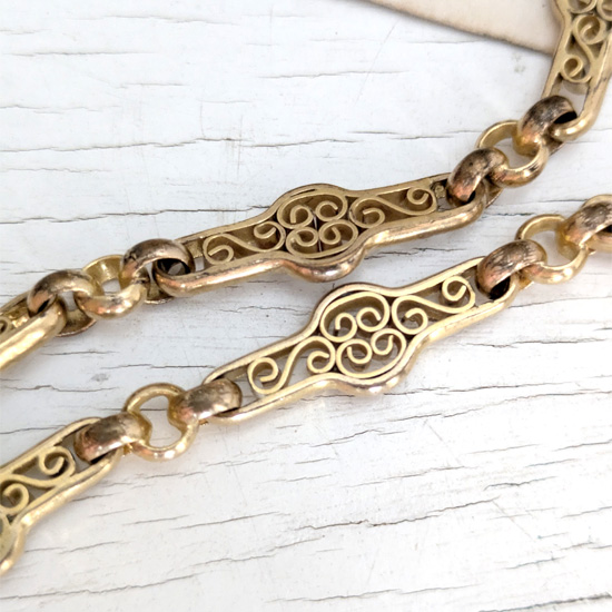 輝く金色と透かしフィリグリー細工が豪奢な懐中時計用チェーンです。ひとつひとつのパーツは厚くしっかりとしているため重厚感があり、高級感があります。留め具部分にフランスの銀器メーカー『TALLOIS』(タロワ)の刻印が押されています。