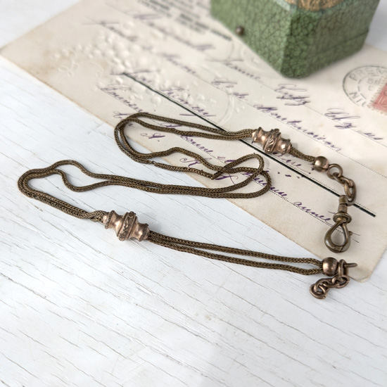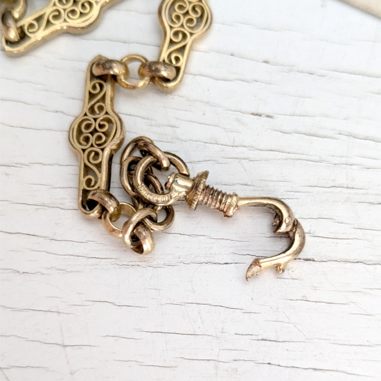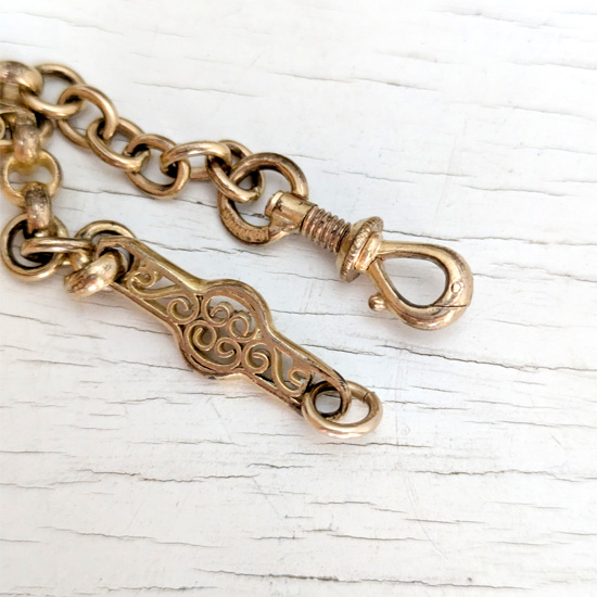 こちらは留め具を下に回転させフックを外すという仕様で、懐中時計のチェーンのほか、2巻でのブレスレットとしてもご利用いただけます。