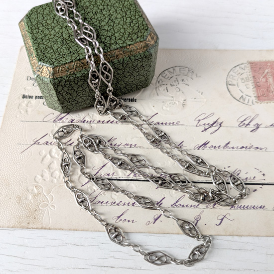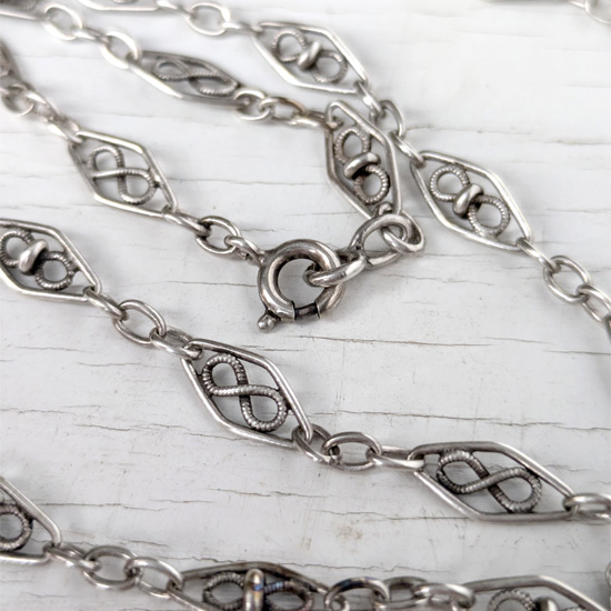銀のフィリグリーネックレスです。ひとつずつ丁寧に∞型に加工された、落ち着いて輝き過ぎない銀色が心地よく、軽やかにエレガントな装いをお楽しみいただけます。歪み等特に気になるところはありません。