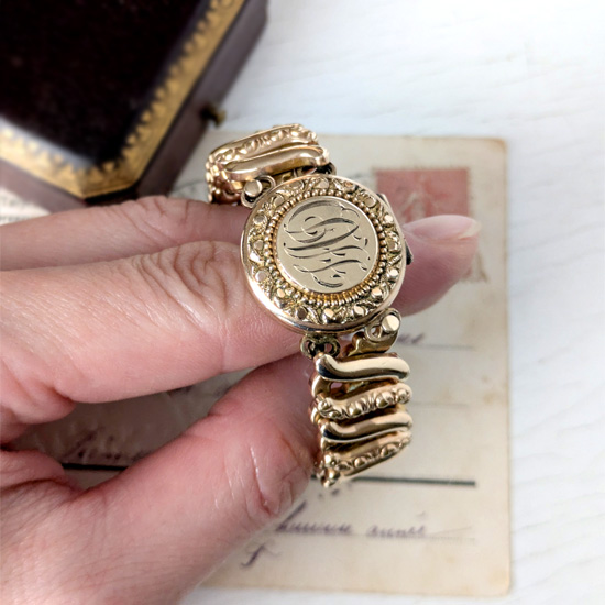 経年による擦れはありますが全体的に状態良く金色の美しさは保たれており、ブレスレットの伸縮も不具合はなくスムーズでロケットもカチリとしっかり閉まります。