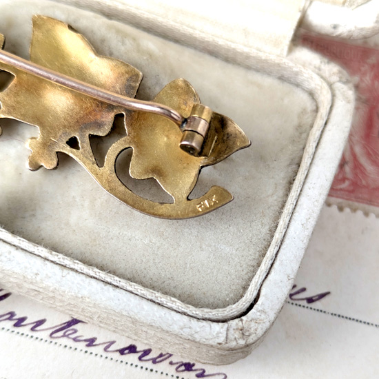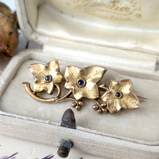 フランスはベルエポック時代、当時のビジューの最先端で活躍していた『BIJOUX FIX』。FIX社の誇る高品質と隙のない美しいデザインは大衆を魅了し、さまざまに数多くの装飾品が作られました。こちらはアール・ヌーヴォーには欠かせない蔦をモチーフとしたゴールドのブローチ。マットに美しく輝く金色はアンティークらしい趣があり、繊細な葉脈から微妙な葉の質感まで見事に表現されています。それぞれの葉の中央にはアクセントの濃いブルーのサファイアガラス。小さいブローチながらもぎゅっと詰まった完成度の高さを感じられます。
