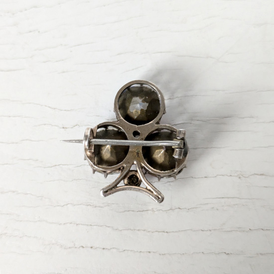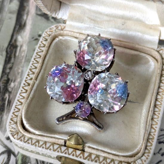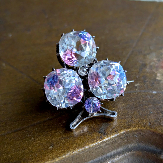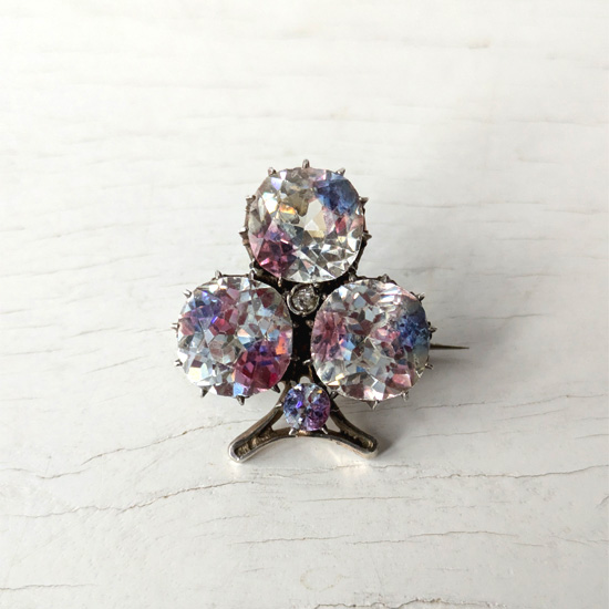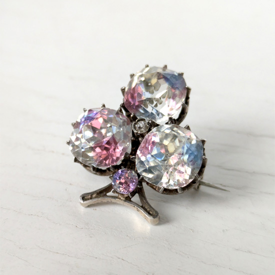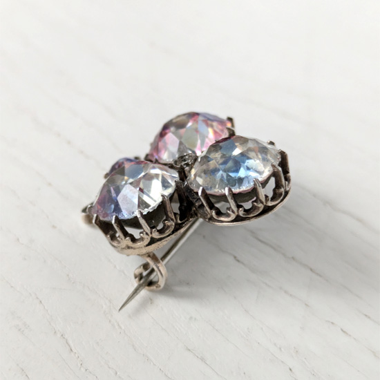 アイリスガラスのクローバー型ブローチです。クローバーを象るガラスストーンは青と赤色の混じり合った美しいトリコロールカラー。中央の小さなクリアガラスと下部の小さなアイリスガラスをポイントに、きらきらとした輝きの中にも奥深さのあるアンティークガラスの美しさが凝縮されたブローチです。