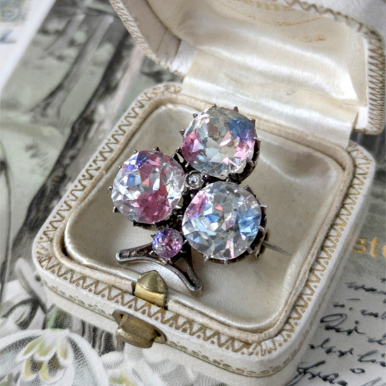 セッティングは繊細に高く王冠のように飾られたクロウ。素材は銀に金鍍金のヴェルメイユと思われます。留め具のCフックにフランスシルバーの猪頭の刻印と工房印と思われる刻印が見られます。バックフォイルの剥離が一部見られますがそれほど輝きには影響しておらず、ガラスストーンにも目立った欠けや傷のない良い状態です。