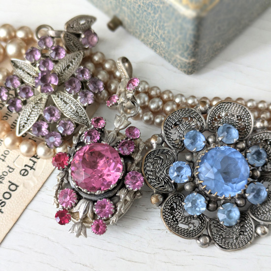 高貴さや気高さを感じさせるアメジスト色ガラスのアンティークロケットペンダントです。花のようなフィリグリー細工のデザインに瑞々しい小粒のガラスストーンが敷き詰められ、アンティークのしっとりとした年月の趣が感じられます。裏面はロケット仕様となっており破損しがちなガラスカバーもダメージなく綺麗に残っており、写真などの想いの品のほか練香水などのフレグランスなどを収めても良いでしょう。チェーンは付属しません。