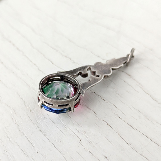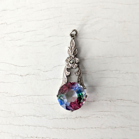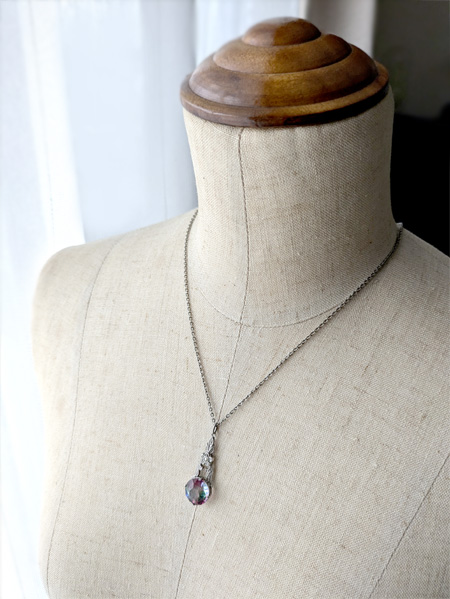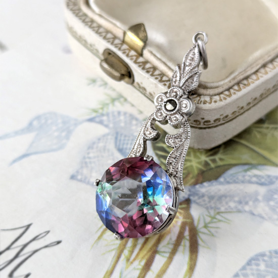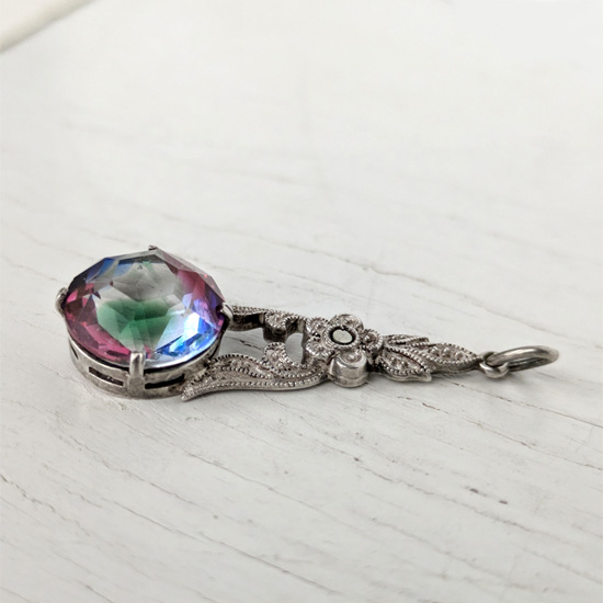 丁寧にミルグレインが施された銀色のペンダントは小さな花の中央には黄鉄鉱の小さな一粒とそれからアイリスガラスと伸びるたおやかなデザイン。アイリスガラスは赤色を主体とした鮮烈な印象と輝きの印象的なカラーで、エレガントでありつつも自然と胸元への視線が向かうような妖艶な魅力があります。