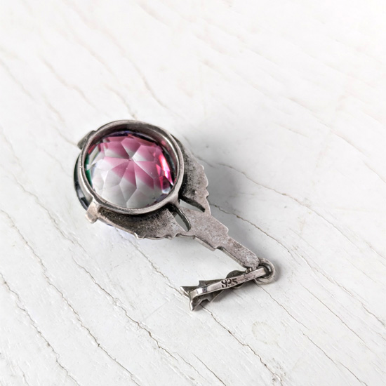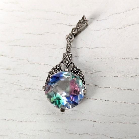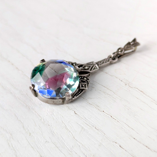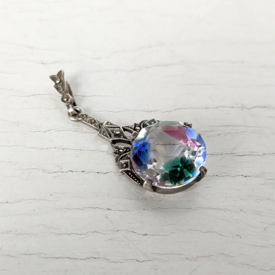 アイリスガラスの銀のペンダントはバチカンに向けて直線を用いた、アールデコ調のシュッとしたデザイン。デザイン対比でよりアイリスガラスを強調しインパクトがある見せ方となっています。アイリスガラスのテーブル面は美しい六角シェイプにカットされ、美しく三色が混じり合い光輝く様はまるでファンタジー世界の宝石のようです。