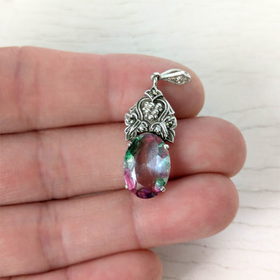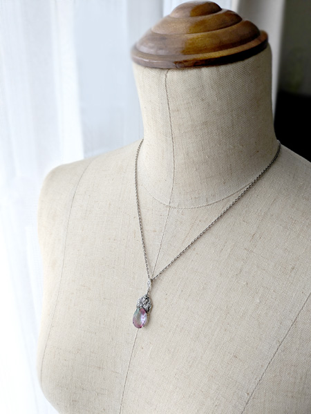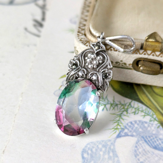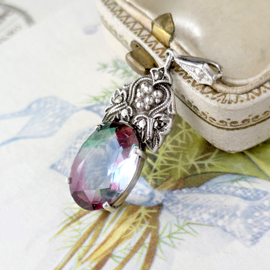 アイリスガラスと葡萄モチーフは定番のようでさまざまありますが、こちらはしっかりと厚みと銀の陰影による立体感のあるつくりのペンダント。両端にはマーカサイトがふた粒きらりと輝きます。アイリスガラスはクランベリーピンクとピーコックグリーンをベースとしたクリスマスのような楽し気なカラーです。アイリスガラスは目立つ欠け傷見られません。