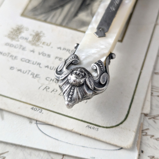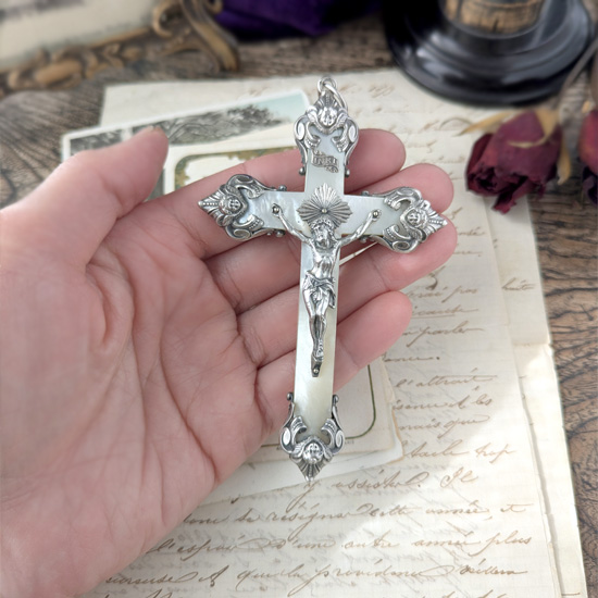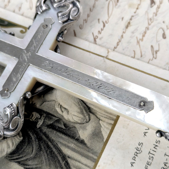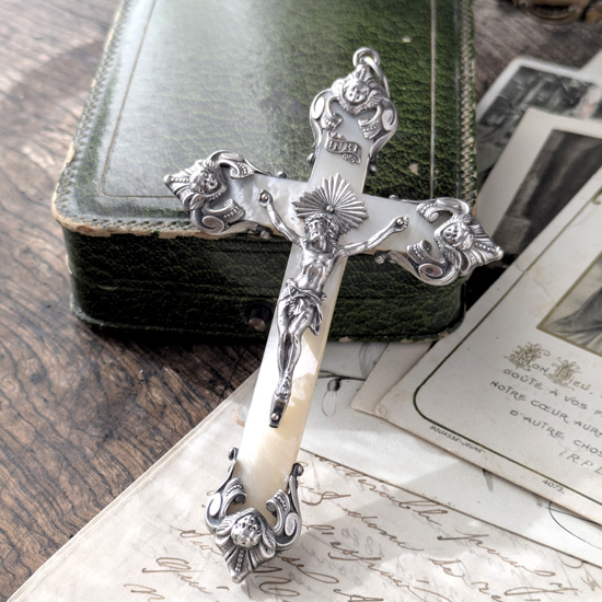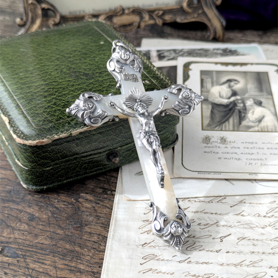 見事としか形容できない、大きく、厚く、素晴らしい細工のマザーオブパール銀の十字架です。キリストの囲う十字の四方は写実的にそして立体的に描かれた小さな銀の天使たち。小さな天使たちはどこか微笑んでいるような、ぜひ表情をルーペなどで見て頂きたいかわいさです。また厚みのあるマザーオブパール十字架は虹色に白く美しく、裏側には記念日が刻印されたシルバープレートで飾られより荘厳さが加えられています。長い長い年月を越えながらも、キリストや天使、パーツのひとつひとつ全て目立つ傷や凹みのなくコンディションの良い素晴らしいクロスは二度と出会えないような逸品です。