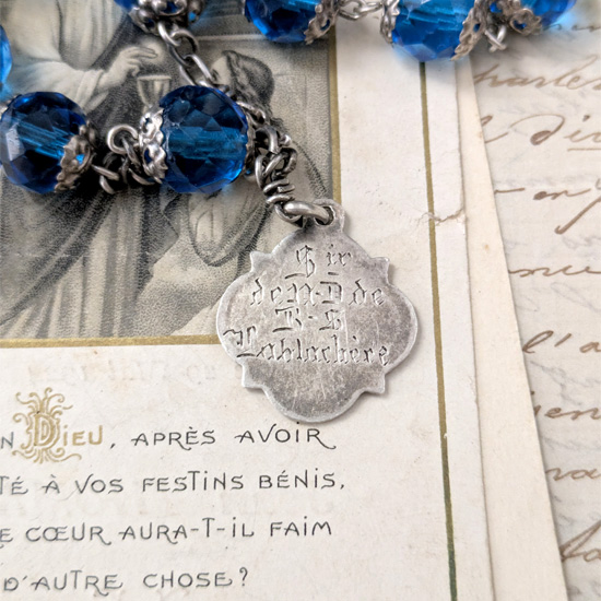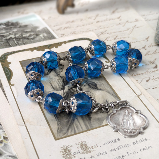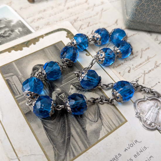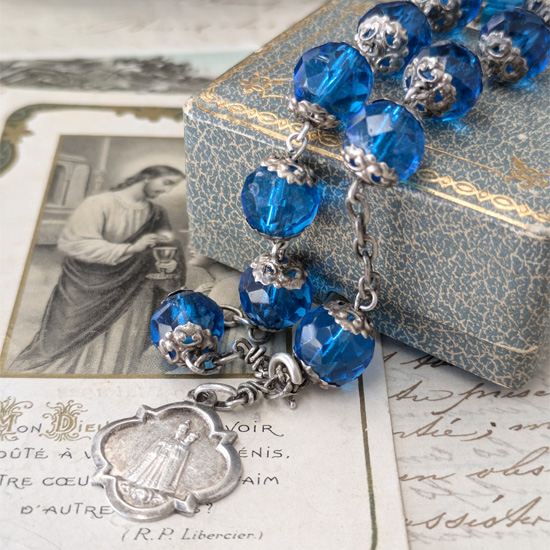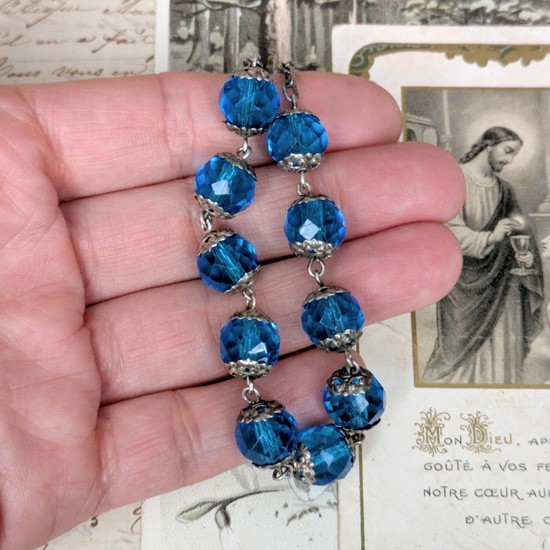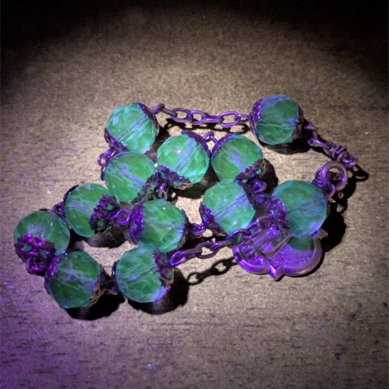 まるで青衣のような目に鮮やかな透き通る青が美しいガラスのロザリオブレスレット。青のガラスロザリオといえば少しくすんだ水色が定番なのですが、こちらのようや鮮やかなブルーは大変珍しくここまで覚めた色のブルーは当店も初めてです。またウラン成分が含まれているのか、ブラックライトで淡く緑色に蛍光する嬉しいおまけも付加されています。