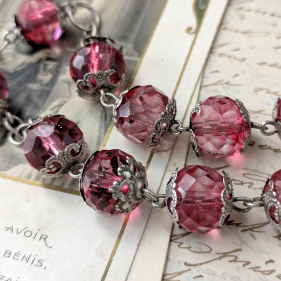 クランベリーピンクが鮮やかな、とても美しく魅了される希少なガラスビーズが使われたロザリオブレスレット。このロザリオブレスレットはフランス語でディゼンヌまたはディザニエと称され、祈りに必要な10の数を示す言葉です