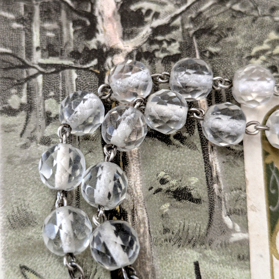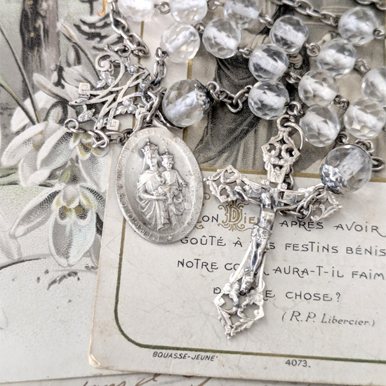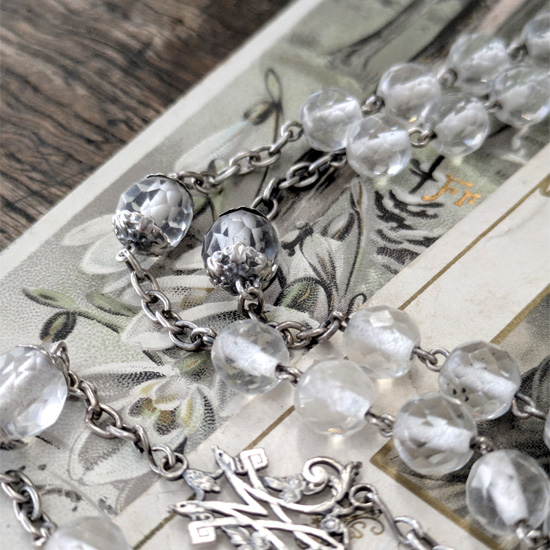 透き通るクリアなガラスビーズと鈍い銀色のコントラストが美しい、清らかに澄んだロザリオ。その涼やかさは己の心を無にして祈る事ができそうです。センターメダイのアールヌーヴォーのシャープなデザインのMがまた素敵で、付属のメダイは心臓を指し示すキリストと聖母子像。