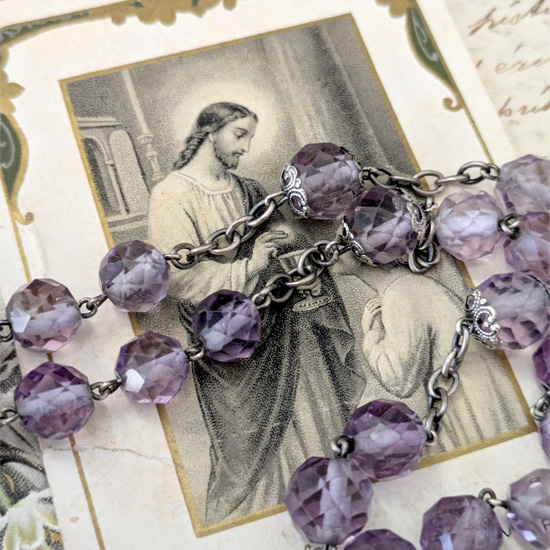 『誠実』『心の平和』の石言葉の紫水晶。その高貴な色の紫水晶のロザリオは、己の精神を高め祈りを深めてくれることでしょう。こちらの紫水晶のロザリオは色味が深く濃い物が使われており、内包物も少なめで全体の透明感があります。ビーズは大き目な約8〜9mm珠が使われ石の確かな手ごたえを感じます。磨かれた鉱物ならではの光の反射も美しく、大変美しく見事なロザリオです。
