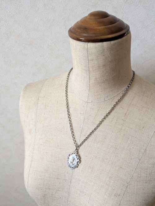 中央の聖体と聖杯はピンクゴールドに輝き、左右には麦などが描き掘られた聖体拝領のシルバーメダイです。左右対称の縦長シンメトリーが与える誠実な印象のデザイン。枠はアールヌーヴォーの象徴のひとつアカンサスで透かし描かれた華やかにかつ整った、まるで紋章のようなメダイとなっています。メダイ裏上部にフランスシルバーの猪頭の刻印が刻まれています。