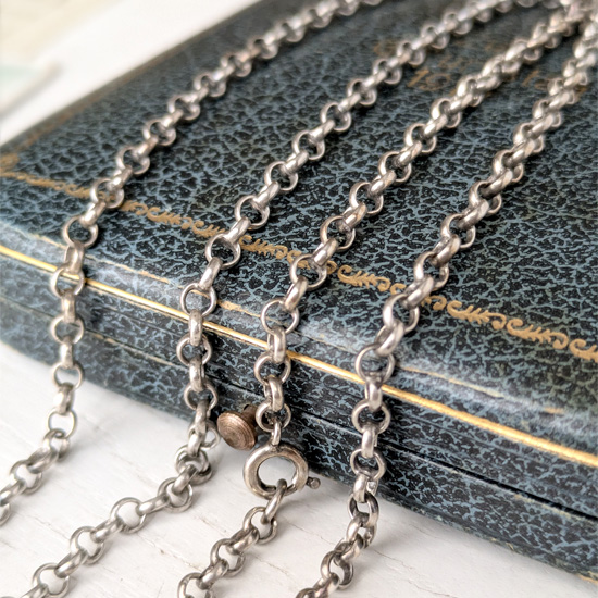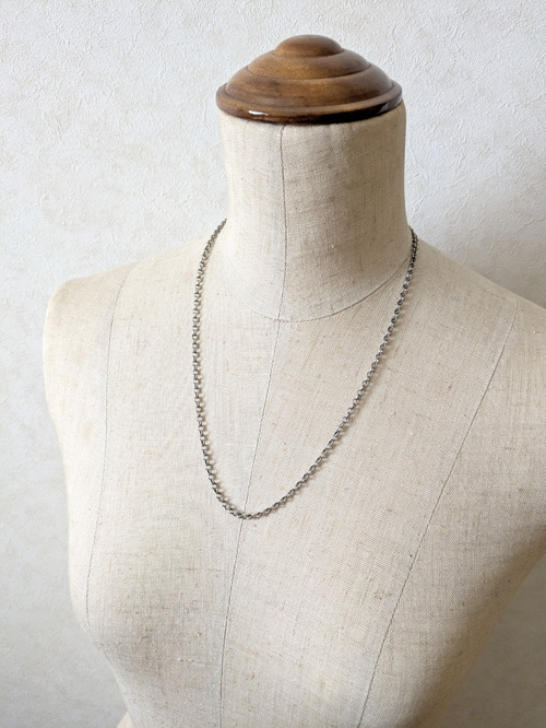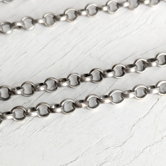 長い年月を経てなめらかに摩耗された質感と、クラシカルな丸みを帯びた銀の輪が連なったアンティークシルバーチェーンです。シンプルな輪の作りだからこそより分かる、新品のチェーンとは別物と言っていいほどのしっとりとした穏やかな雰囲気が感じられます。大き目のメダイや重厚感のある細工物などに良いでしょう。