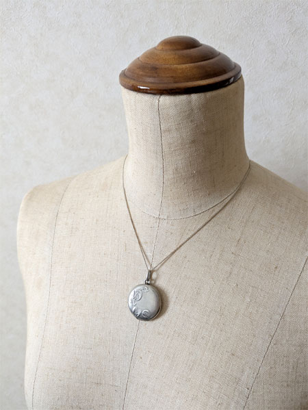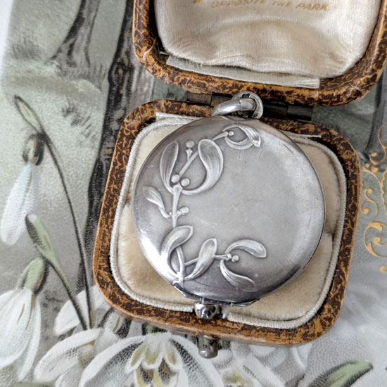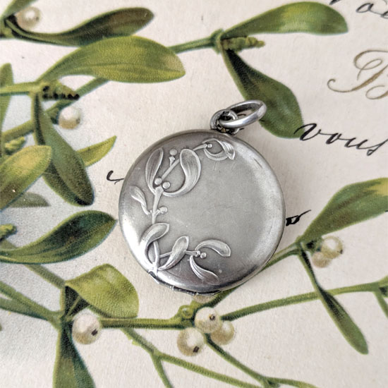 生命と豊穣のモチーフ、ヤドリギのシルバーロケットペンダントです。こちらは縦型に開くタイプで、写真などさまざまな物を収められます。約百年による時間の経過で滑らかでしっとりとした銀の質感の趣ある品です。開閉は問題なくカチッと閉まります。