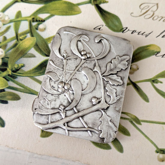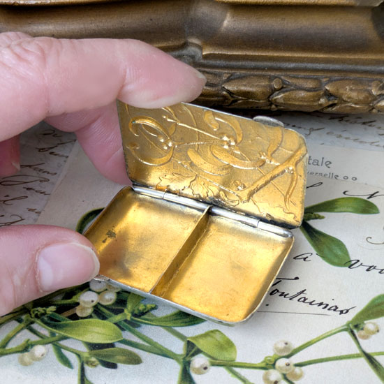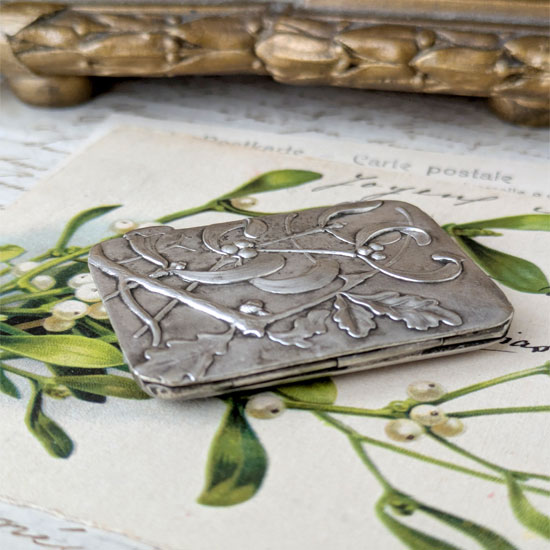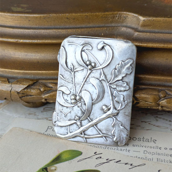 アールヌーヴォーデザインの象徴のひとつでもある生命力あふれる植物、ブナの木に寄生するヤドリギが描かれた小さな切手ケースです。内側は金塗りが施され今も変わらない金の輝きがとても美しいです。蓋は強めのばね圧になっており、自然と開く事なくカバンやポーチなどに収納できるので薬や小さなアクセサリーなど入れたり等の携帯用にもご利用できます。